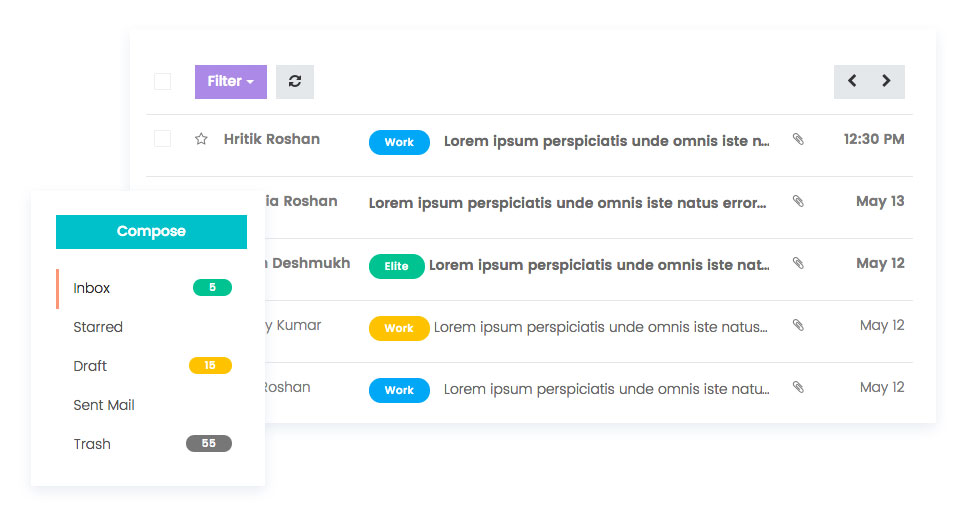 Yup, Mail Box Application is added with Elite Admin - Responsive Kit. We have included templates for Inbox, Compose Mail, Mail detail.
